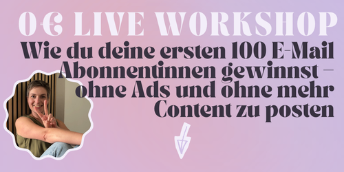 Melde dich jetzt zum 0€ Live-Workshop an und erfahre, wie du deine ersten 100 E-Mail-Abonnentinnen gewinnst – ohne Ads zu schalten und ohne mehr Content zu posten.